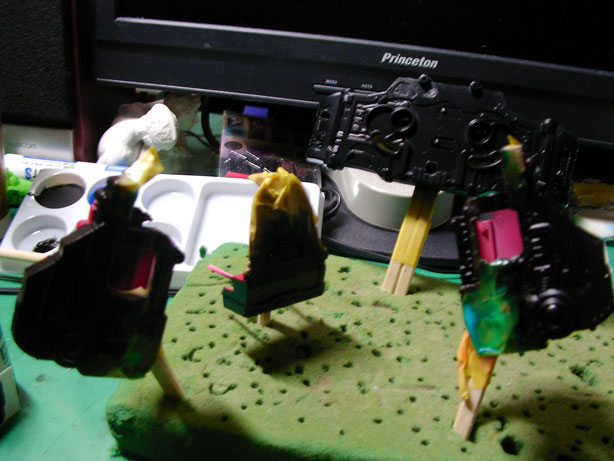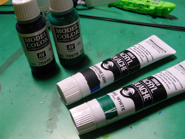 ちなみにアクリルガッシュは黒のグリーンを持っていません。しかしこんな馬鹿なネタの為に1550GPも払えるほど俺は金を持っていないのでこおは容赦なくファレホで塗りつぶすぜ!