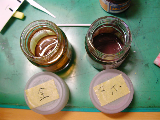 ゴールドはそのままで、マホガニーはマホガニー70+黒30で調整。えーちかさんのイラストだと若干薄目なんだけど、立体的には濃い方が良いかナーって…ってなんだか言ってることがバラバラだな。それって駄目なんじゃ………