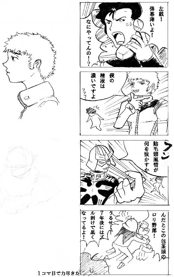 書いてあるとおり、一コマ目で力尽きました。しかもトレスで、さらにトレス素はトニーたけざきの方のガンダム漫画だったり…あの人はおもしろいわ。はよ3巻でないかなぁ