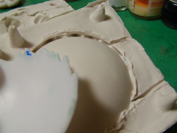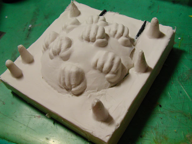 次に、板パーツを粘土からはがし、以前作った拳パーツをめり込ませます